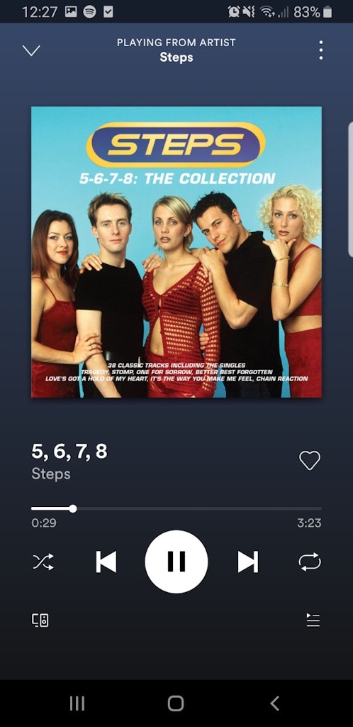 Turns out pulling up the currently playing song and tapping the unfamiliar bottom-right icon pulled up the queue, but by the time I got there, we were already onto Tragedy. Fitting.