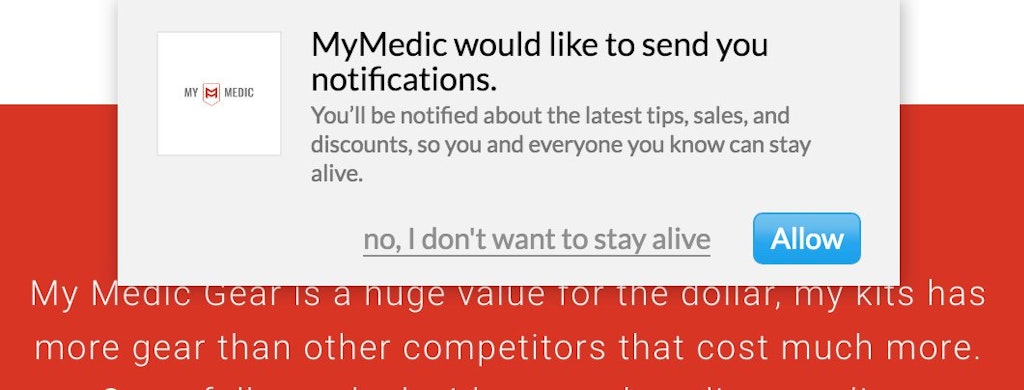I mean, that’s pretty brutal. This is downright trying to scare the user into allowing notifications or otherwise die. I don’t even think we can class this as bad UX, it’s more like an illustration of corporate sociopathy. (credit to https://twitter.com/i_anic/status/1039127723388612609).