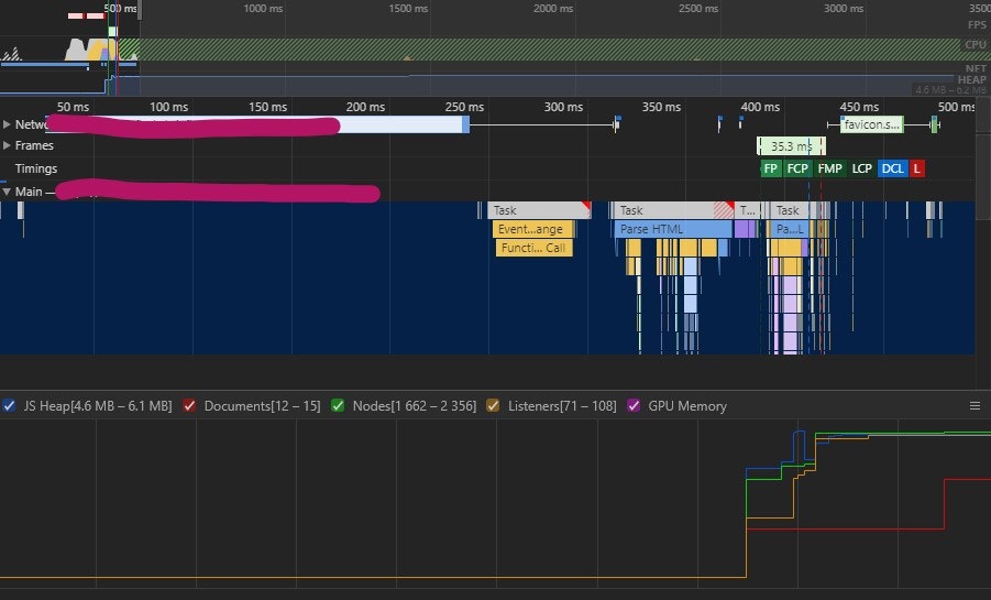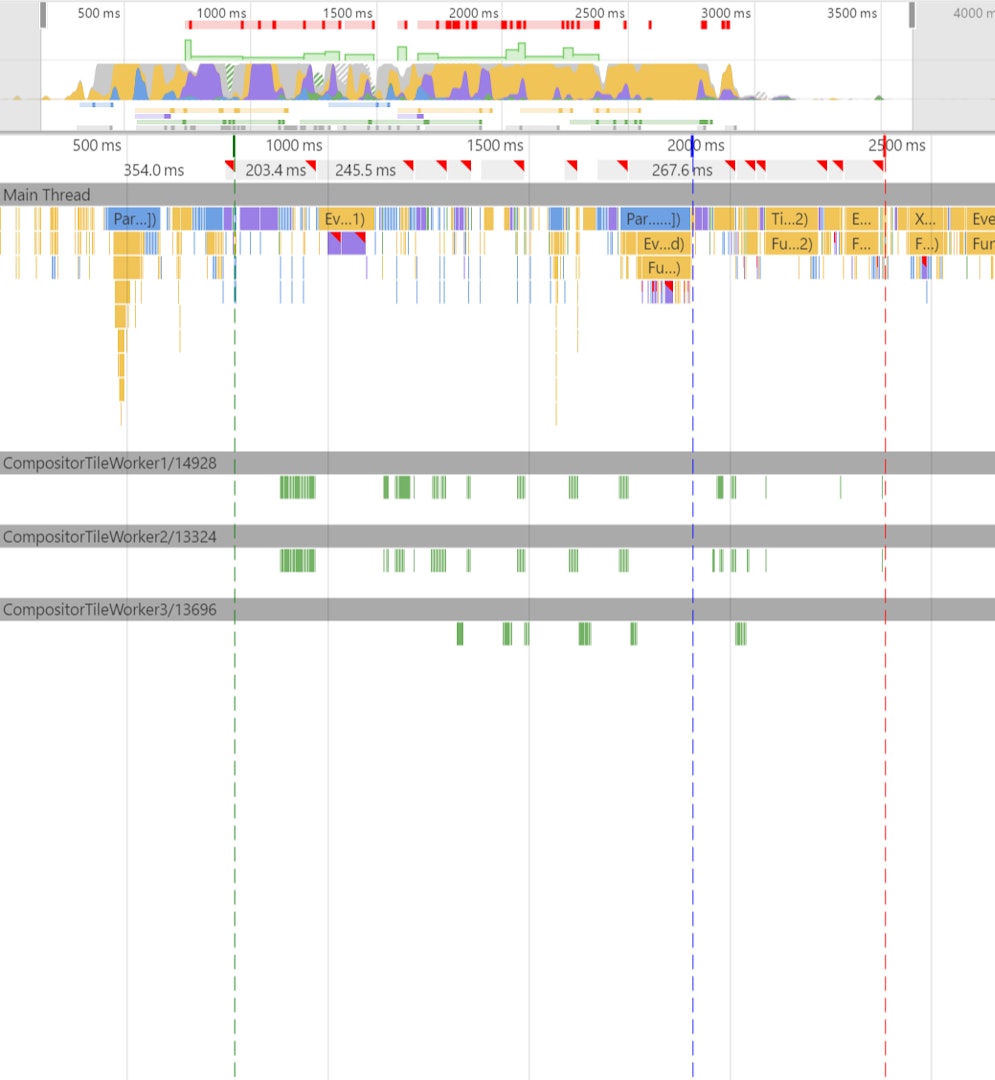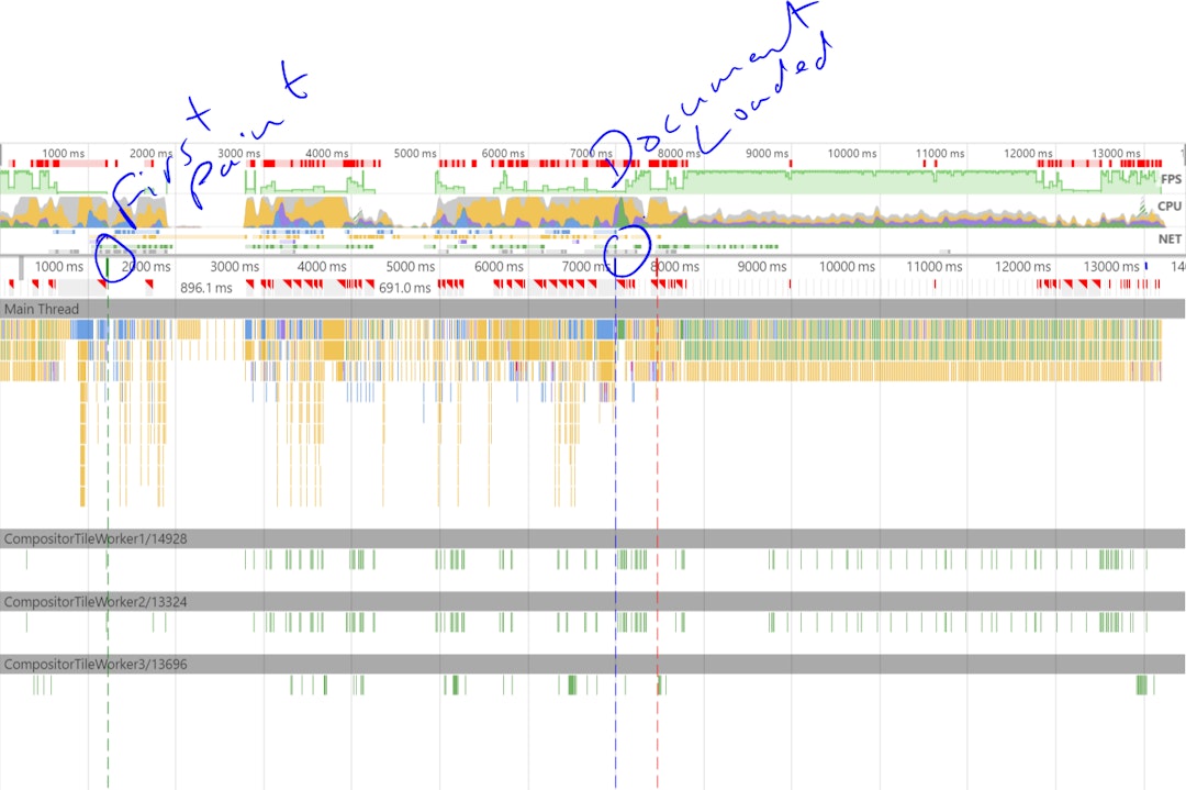 The site wasn’t perfect, at all. The client had also been asking for lots of features, in a hurry and cheaply. When code is written quickly, efficiency often takes a back seat. When code is written carefully with plenty of time it can be super-tight. However, the images show that the first draw of the page was done 20% faster without adverts… but the document load was just done in about 30% of the time. That perception, where the document has loaded and everything is now smooth in the browser really really matters. Ideally, you push out pages even faster. We’ve just built a SaaS application for a client where a page has typically finished being useful in around 500ms, often less. Things have usually started to happen visibly on a page within 250ms. This is how it looks when analysed in Chrome: