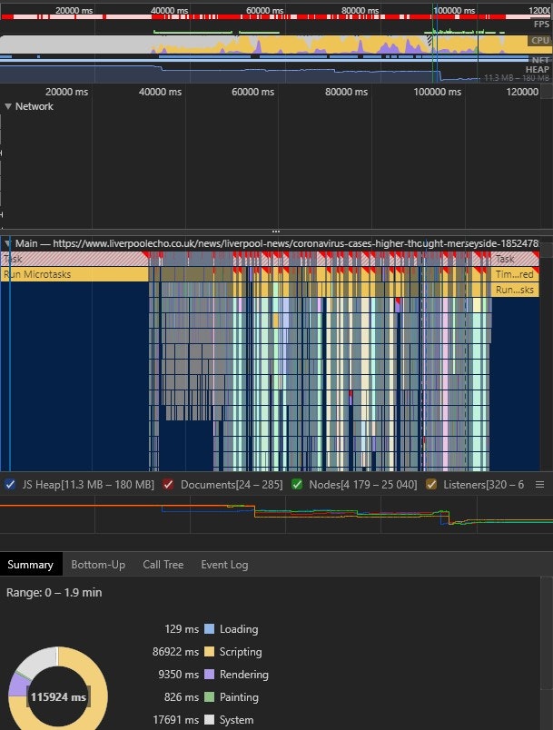 Now for fun, let’s take a look at a website whose adverts I hate… I wasn’t going to name names, but sod it – it’s an energy consuming horror show of a website when it comes to ads. Sure, it’s free local news, and I hugely respect the writers they have and many of their staff. But this approach just isn’t sustainable. In fact, after ninety seconds of profiling, the page started to reload! My CPU fans are now spinning as my machine heats up. That’s crazy. It’s a document with an article in it. How can it be so bad?