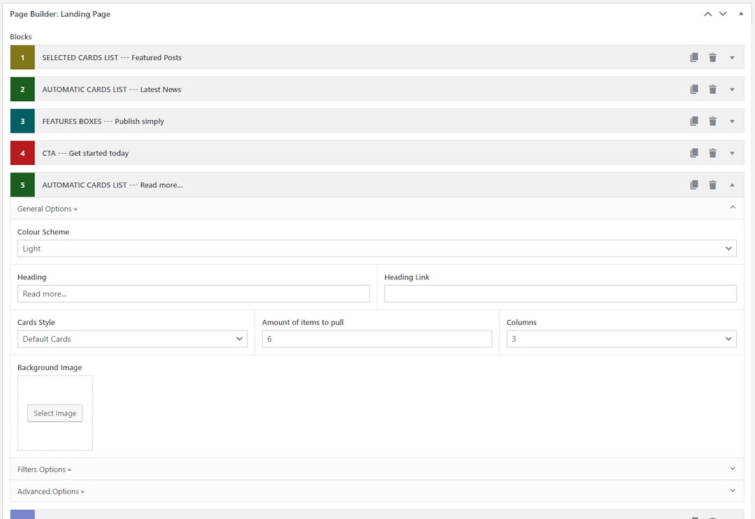 With a bit of custom development work, we managed to have a very sleek interface with expandable blocks, which provides a good overview of the page content and allows the WordPress admins to easily add Blocks and re-order them by simply dragging and dropping into another position.