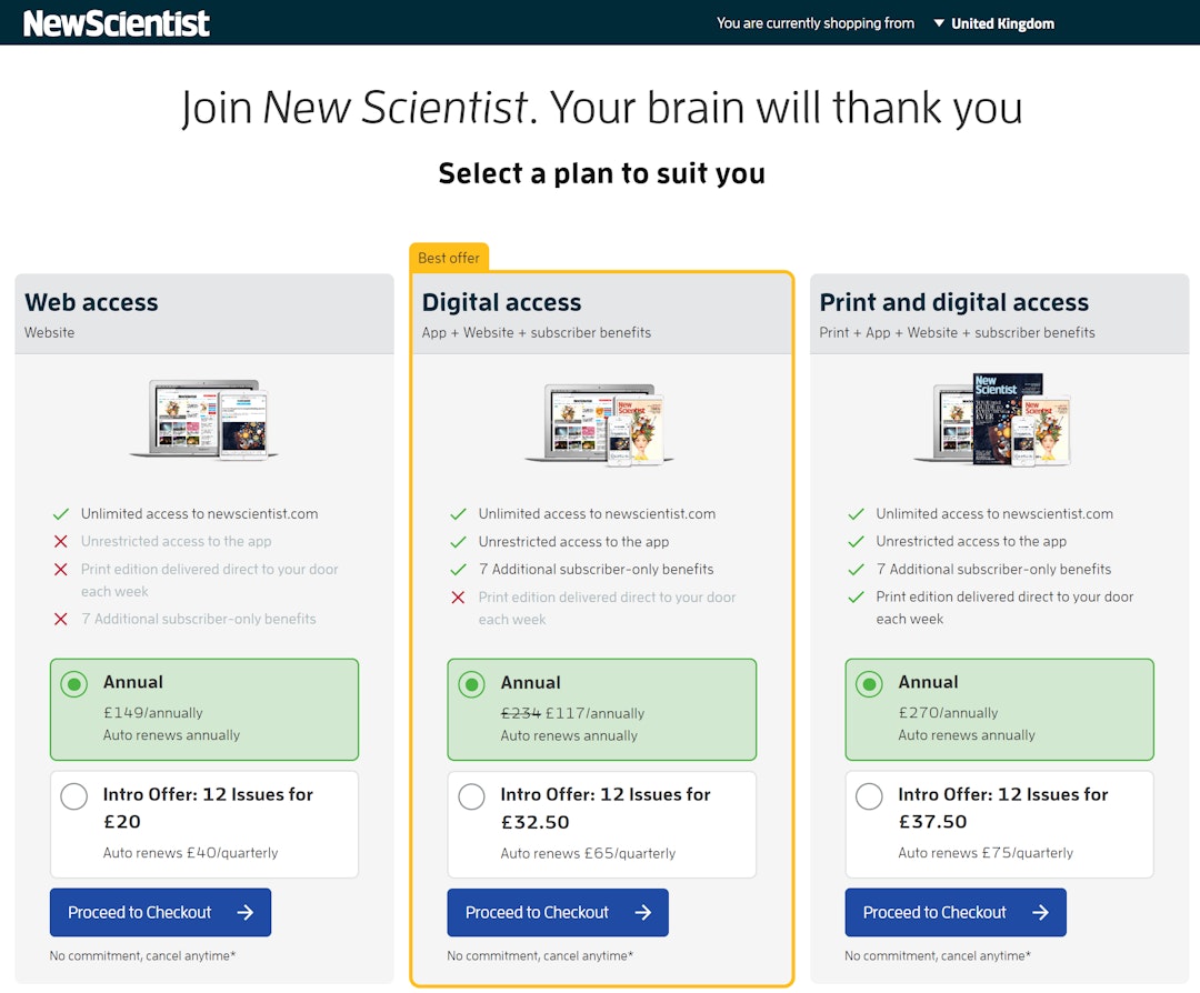 One of my favourite publications, but not one I subscribe to, is New Scientist. Here’s their subscription page: