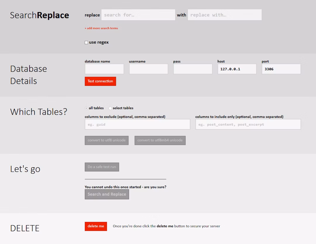 Not as dangerous as it used to be! For convenience, we picked up the WP config variables to prefill the database details. Problem with that is that it turns out people are careless and would leave the script lying around on their production facing server. So that had to go. Convenient for dev installs, nightmare on a production server. It's still a powerful tool, and it gives access to a hacker to try and brute force your database credentials, so it's really important that you don't just leave the script lying around still, but if you are using this on production servers and you are a bit absent minded then you won't be punished by getting hacked quite so easily.