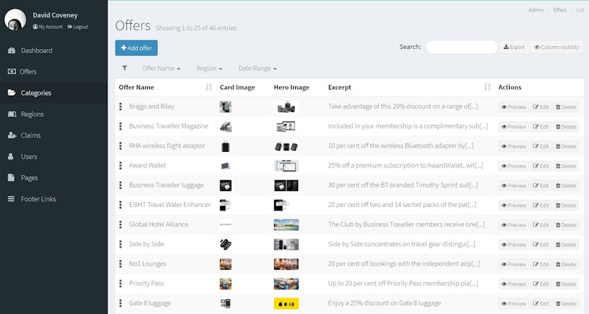We developed a new platform to allow for easy management of offers. This can be styled up to match the branding of any organisation. In this case there was custom branding specific for The Club, which was applied to this project. We delivered a complete solution built with PHP on the Laravel framework, with additional work to integrate to Engine Shed, as used by Business Traveller for subscription management.